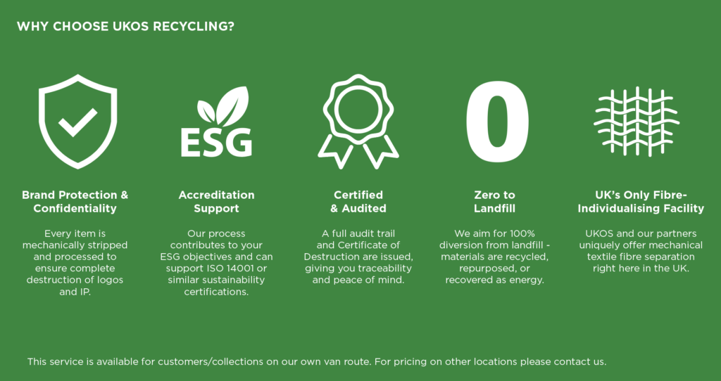 At UKOS, sustainability is not a trend – it’s a commitment. UKOS bring you a secure, closed-loop Workwear & PPE Recycling Service that helps your organisation meet environmental goals while maintaining brand integrity. In partnership with Race Recycling, and backed by the proven success of an award-winning closed-loop recycling scheme, we offer a solution that helps your business meet environmental goals, reduce landfill waste, and protect your brand integrity – all while doing the right thing for the planet.